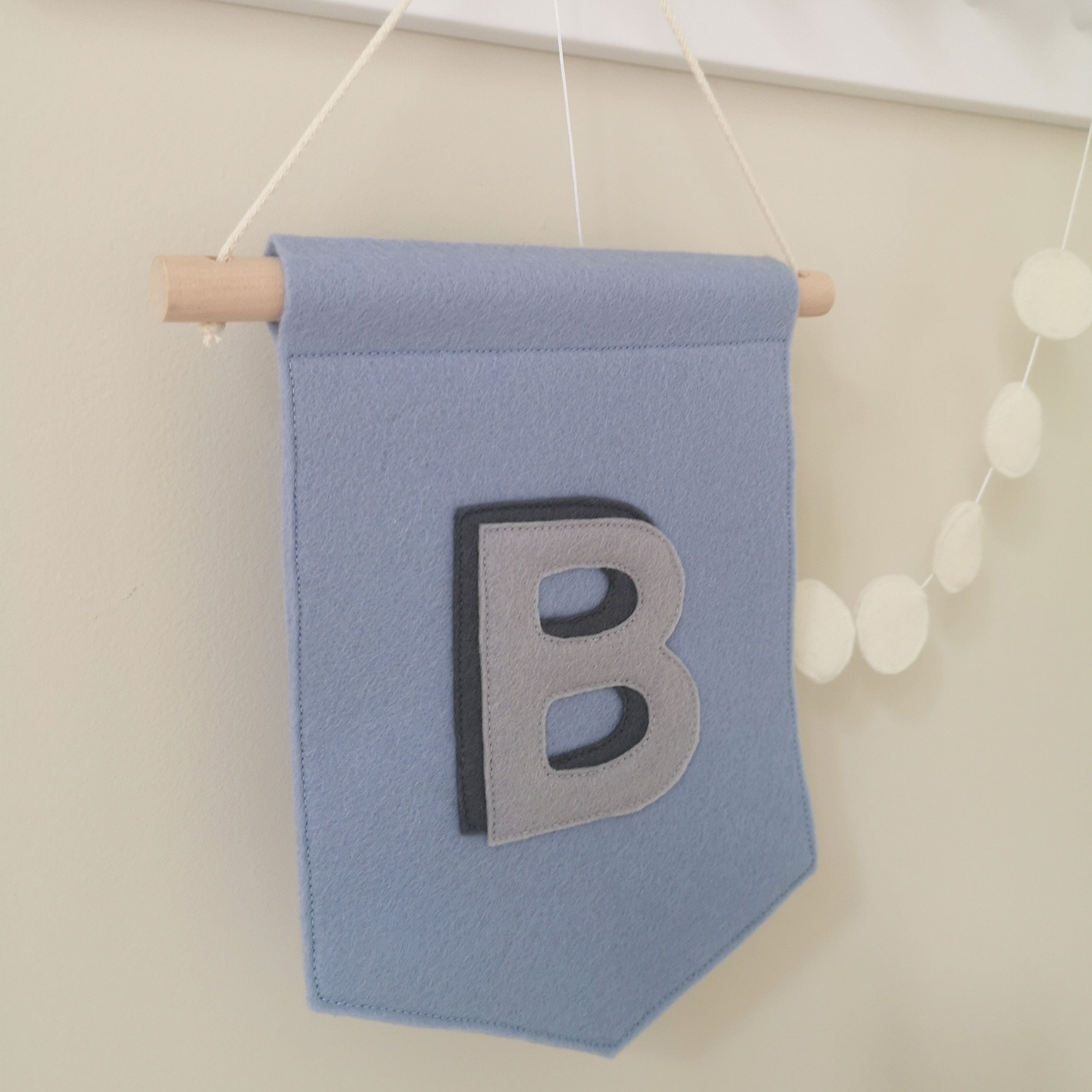 Personalised banner in wool felt with letter - Choose between 18 colours - baby blue and grey