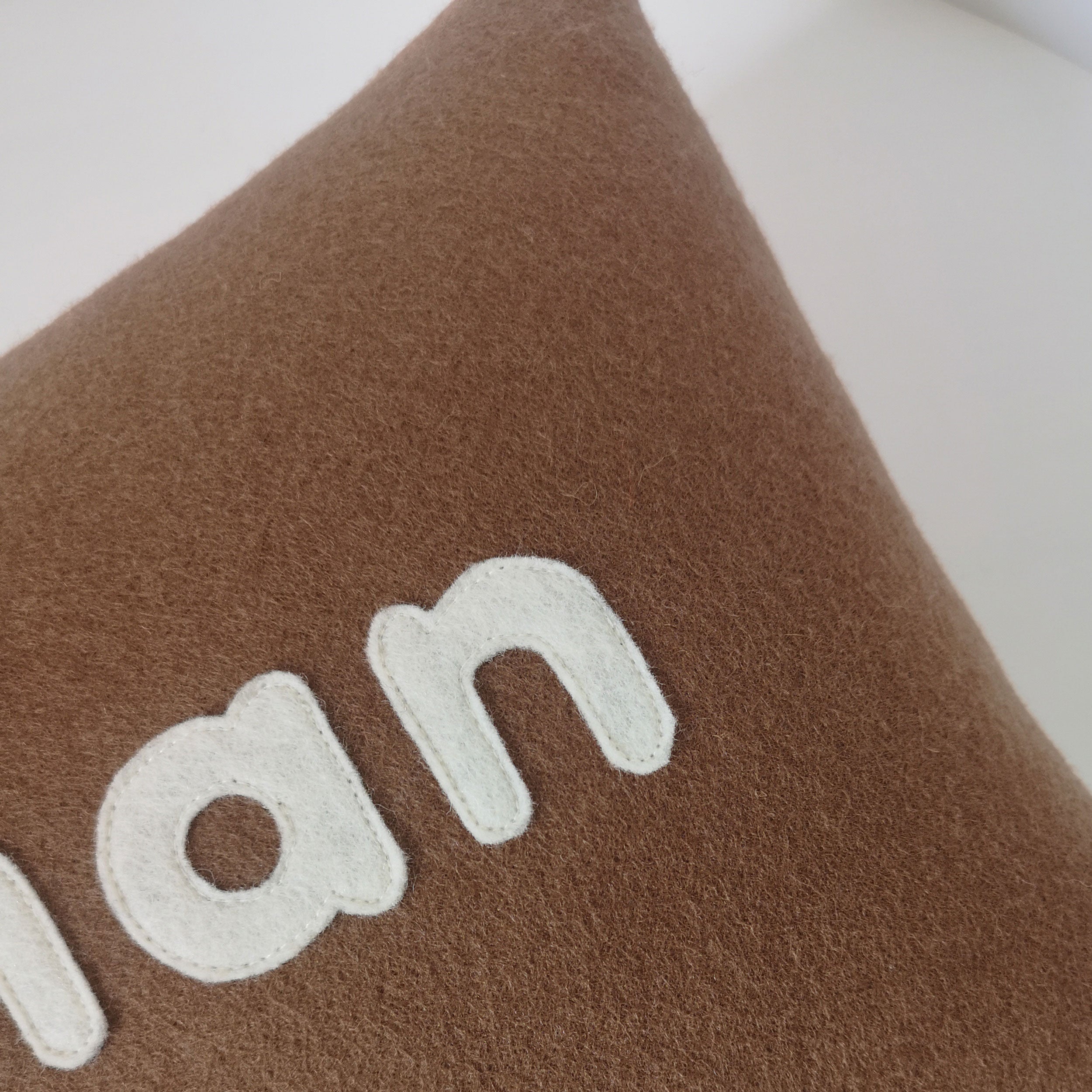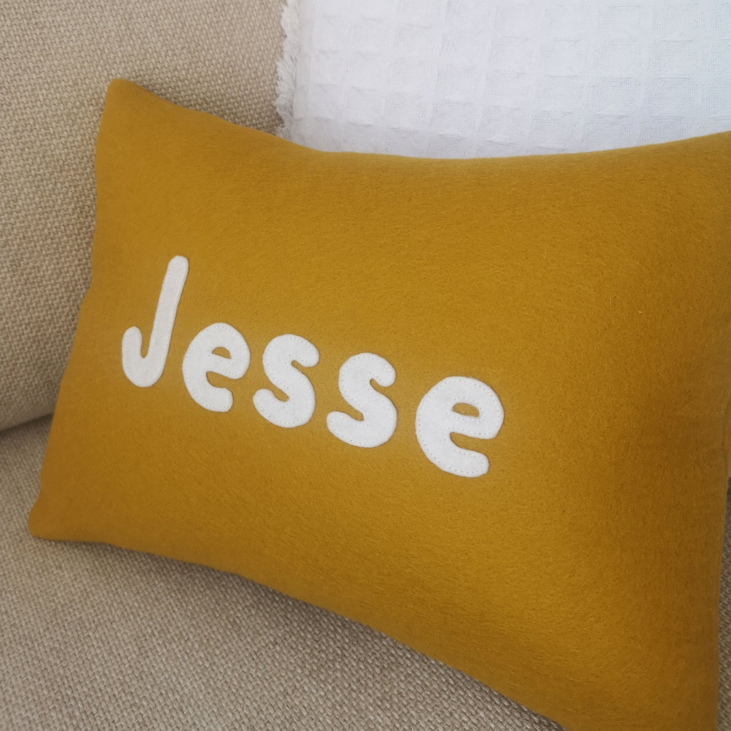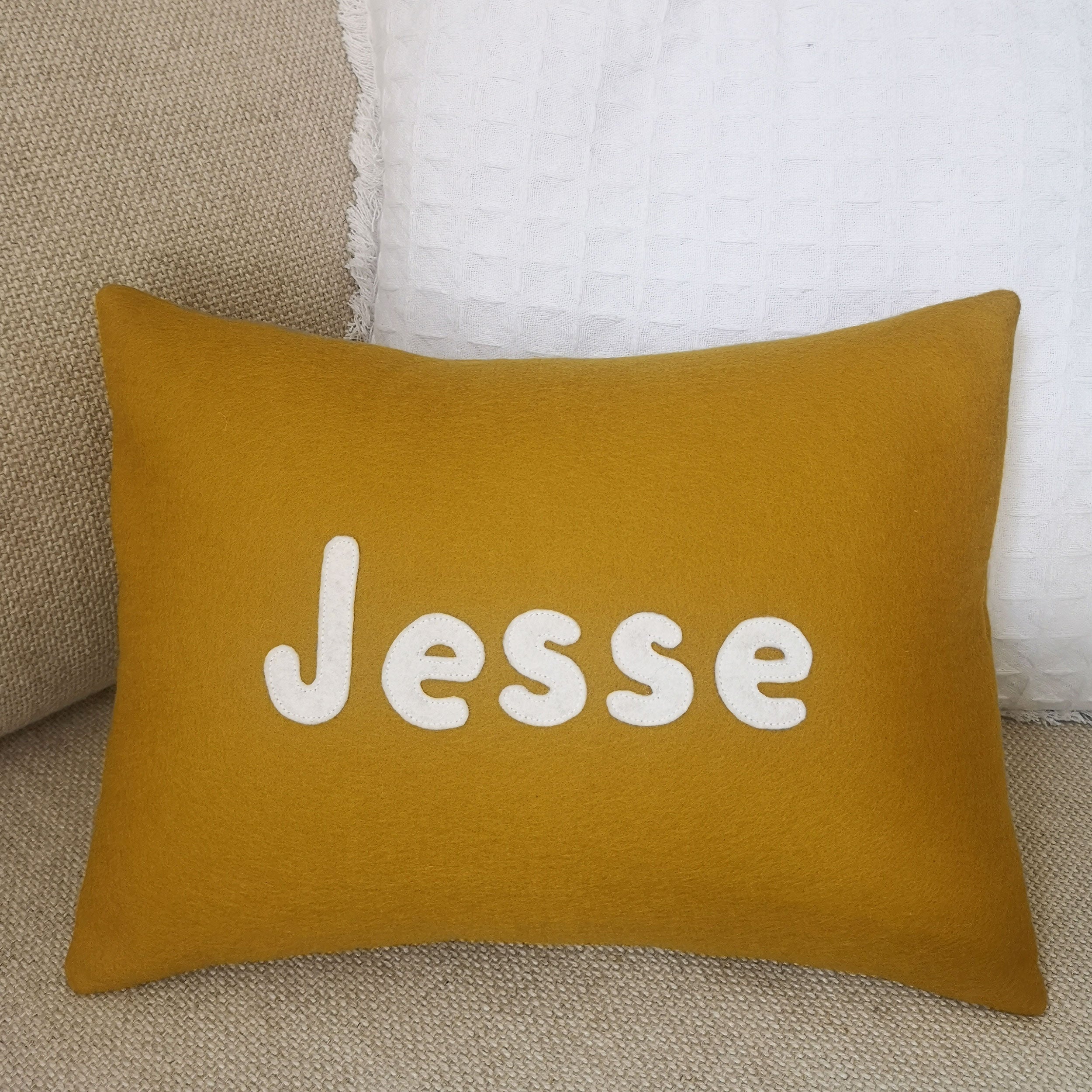 Personalised Cushion With Name in Mustard Yellow and White Wool Felt - 18 colours