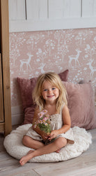 Wallpaper with bambis and trees, woodland theme with dusty pink background and cream white motifs, printed onto a high-quality non-woven paper (traditional wallpaper).