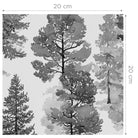 Wallpaper with pine trees in black and greys, printed onto a high-quality non-woven paper (traditional wallpaper).