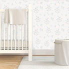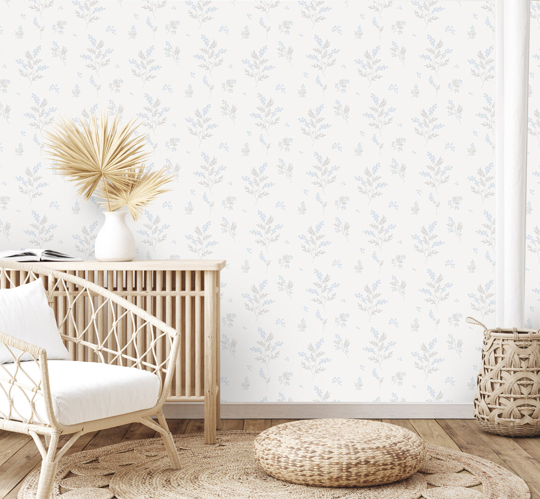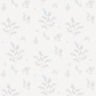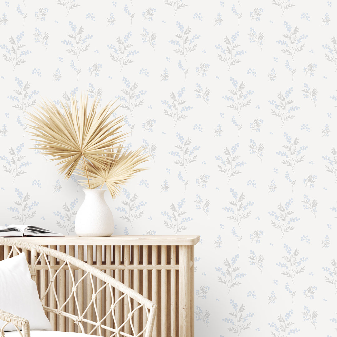 Wallpaper with leaves and flower bulbs in grey and blue printed onto a high-quality non-woven paper.