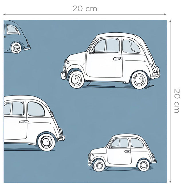 Wallpaper with white cars onto a sky blue background, printed onto a high-quality non-woven paper (traditional wallpaper).