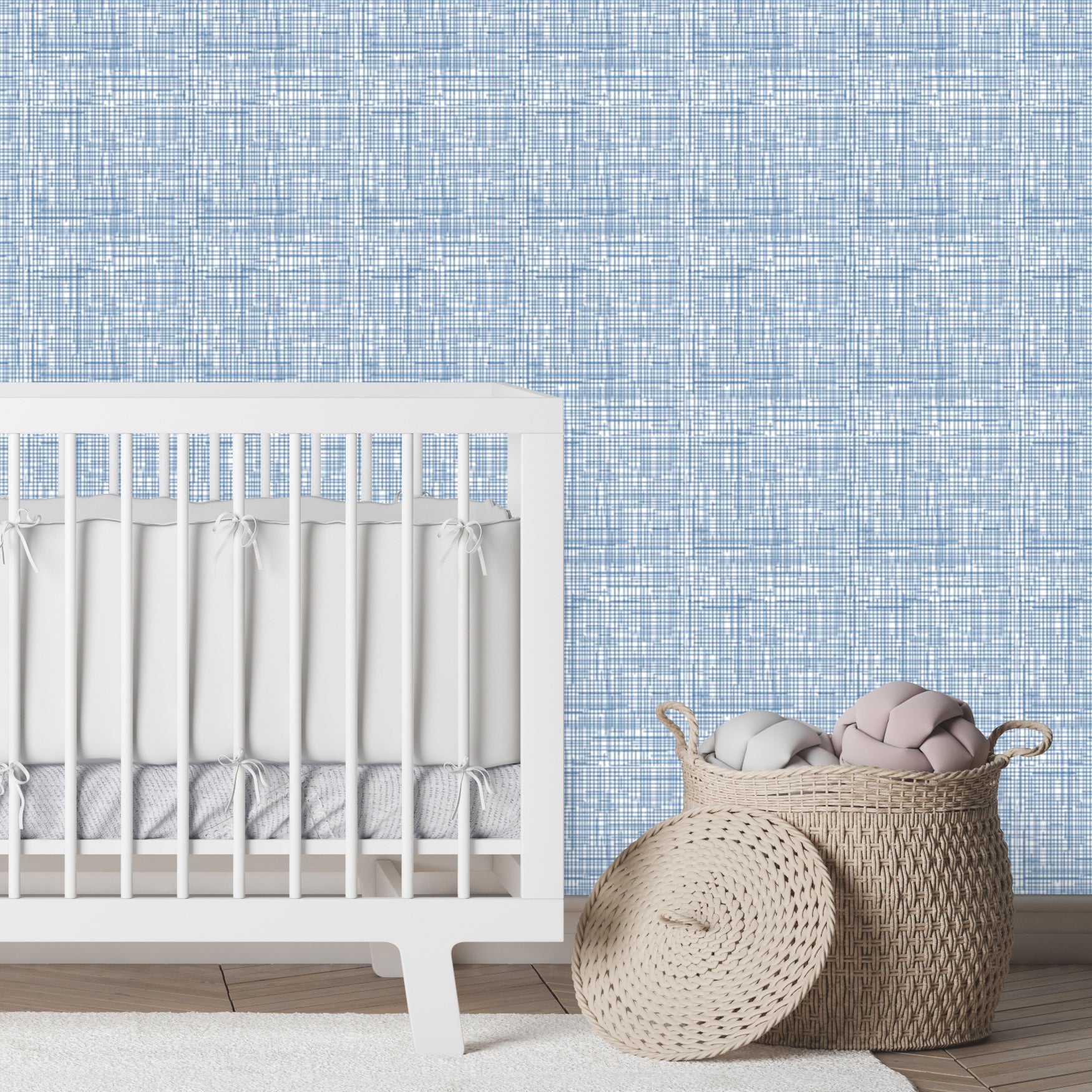 Wallpaper with weave grid pattern in navy blue and white printed onto a high-quality non-woven paper.