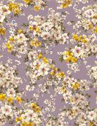 Wallpaper with flowers in lilac, yellow and whites onto a lilac background, printed onto a high-quality non-woven paper (traditional wallpaper).