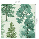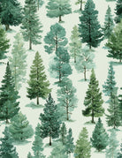 Wallpaper with pine trees in greens onto an off-white background, printed onto a high-quality non-woven paper (traditional wallpaper).