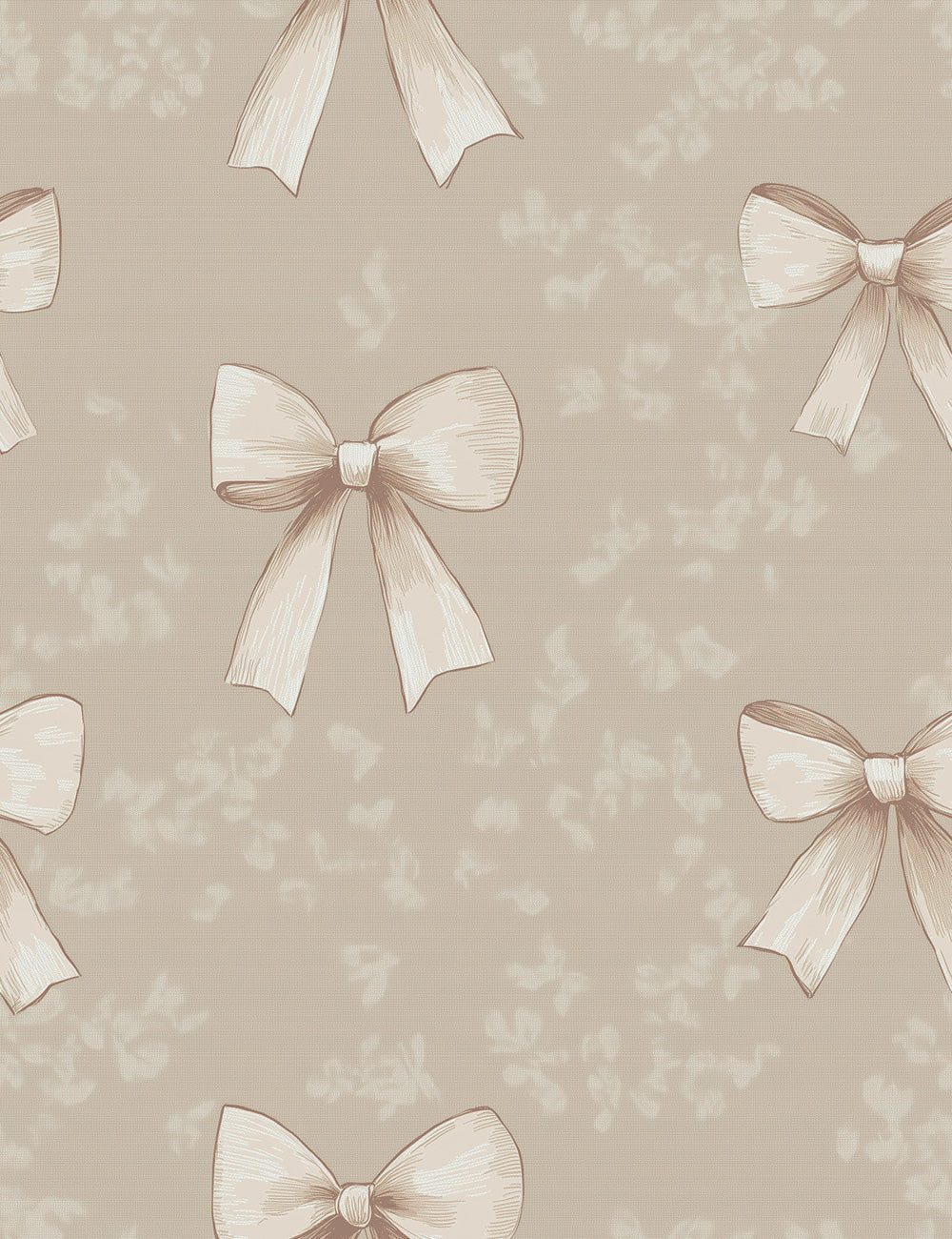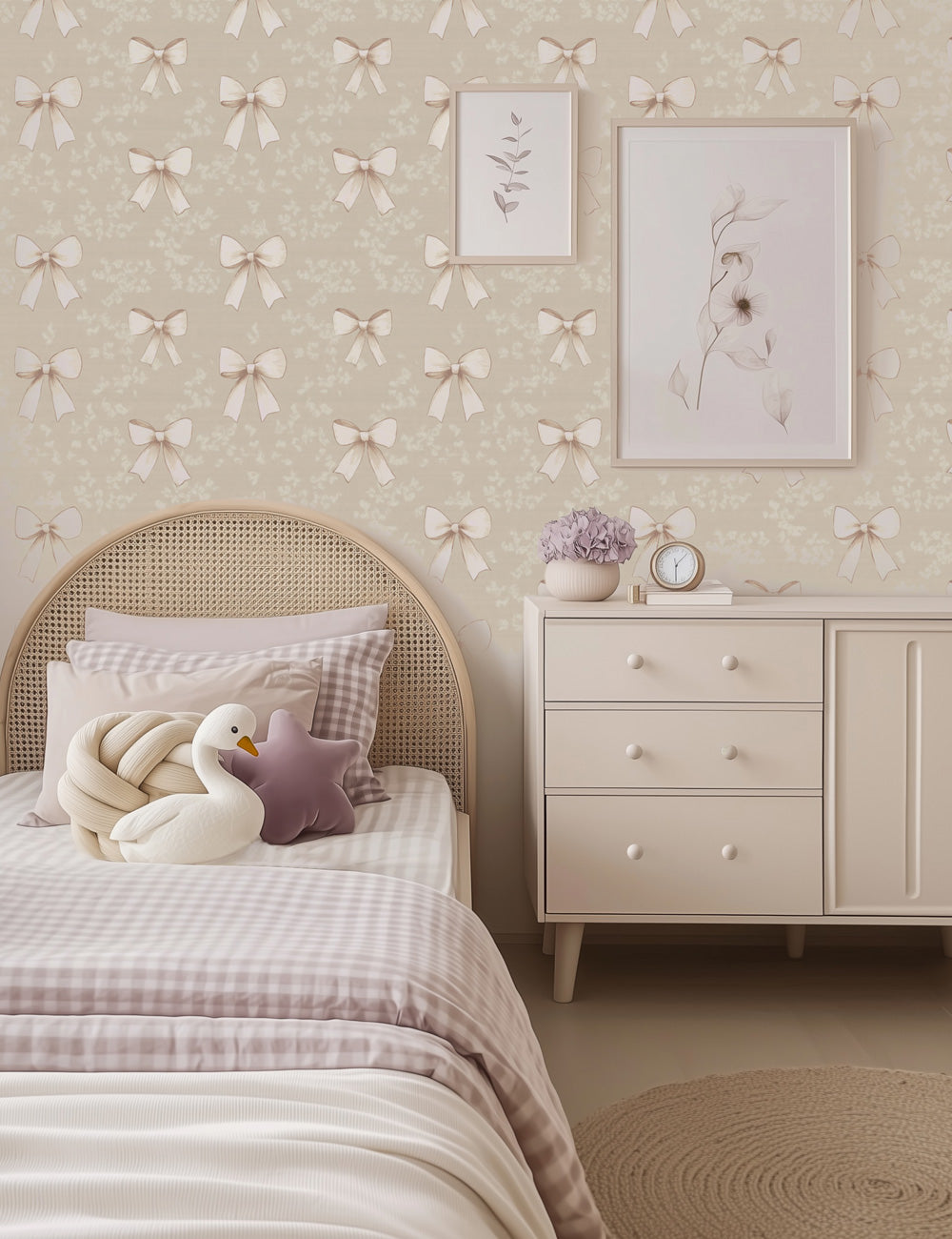 Wallpaper with bows in grey and cream white colours, printed onto a high-quality non-woven paper (traditional wallpaper).