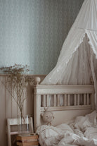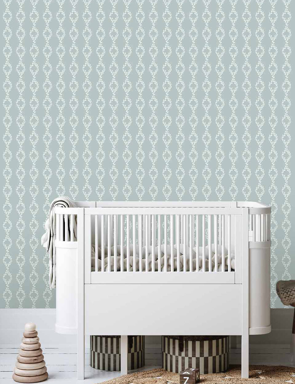 Leafy wallpaper in sage green and white printed onto a high-quality non-woven paper