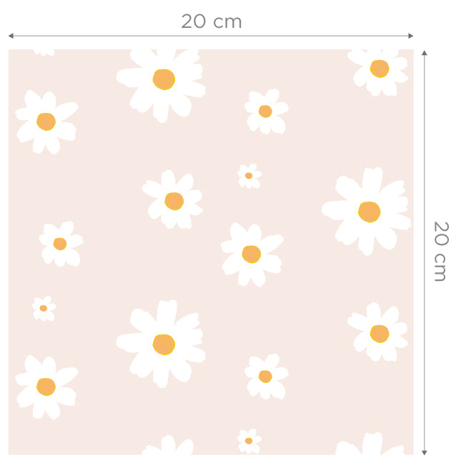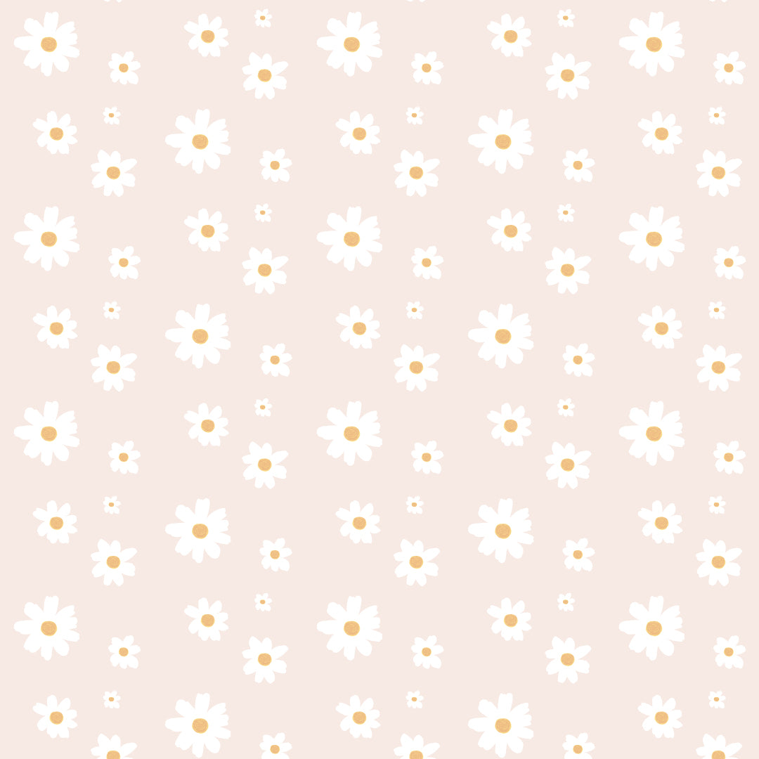 Wallpaper with white daisies onto a nude pink background printed onto a high-quality non-woven paper