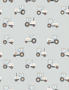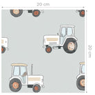 Wallpaper with tractors in beige and grey hues, printed onto a high-quality non-woven paper (traditional wallpaper).