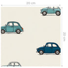 Wallpaper with blue cars onto a cream white background, printed onto a high-quality non-woven paper (traditional wallpaper).
