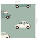 Wallpaper with vintage cars in sage green and cream white hues, printed onto a high-quality non-woven paper (traditional wallpaper).