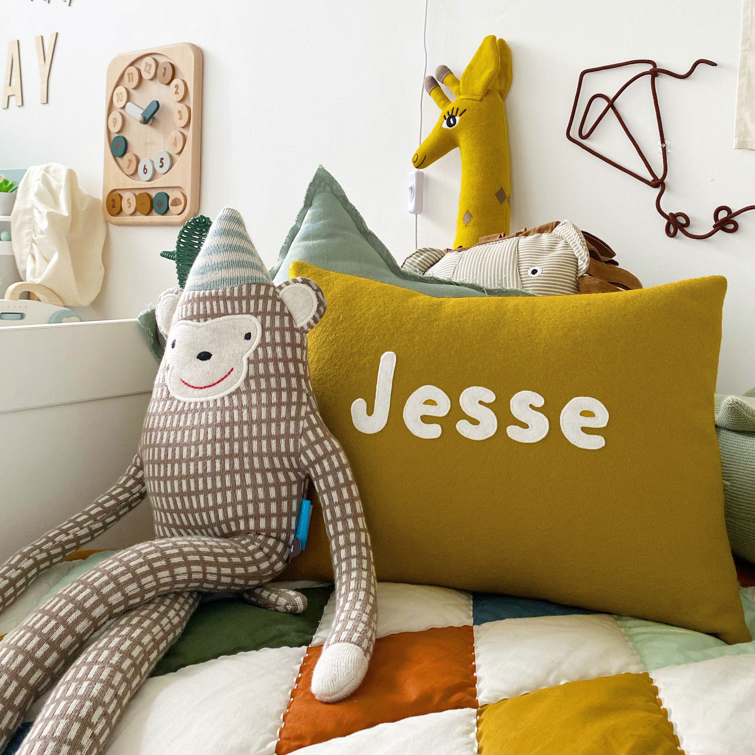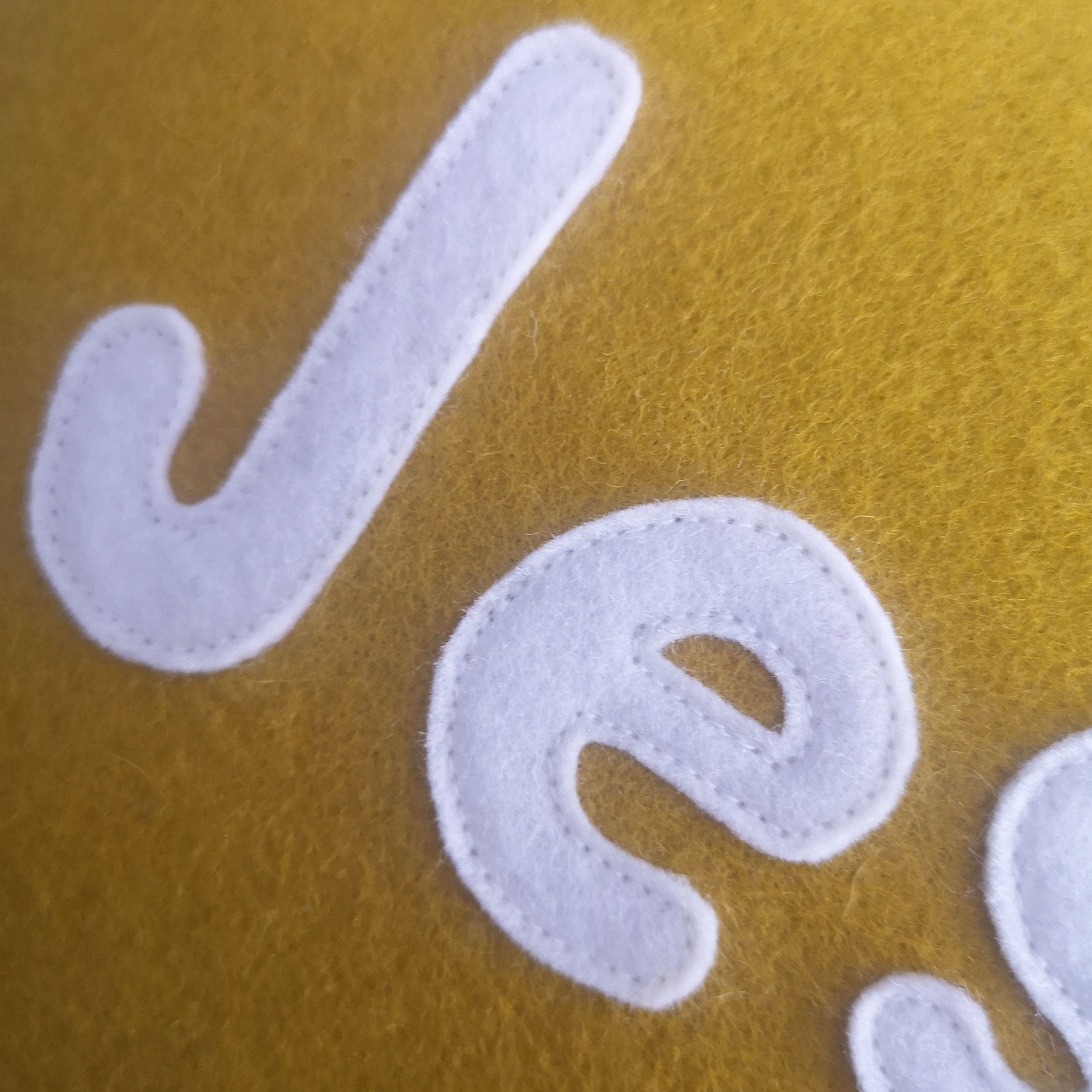 Coussin personnalisé avec prénom en feutre de laine jaune moutarde et blanc