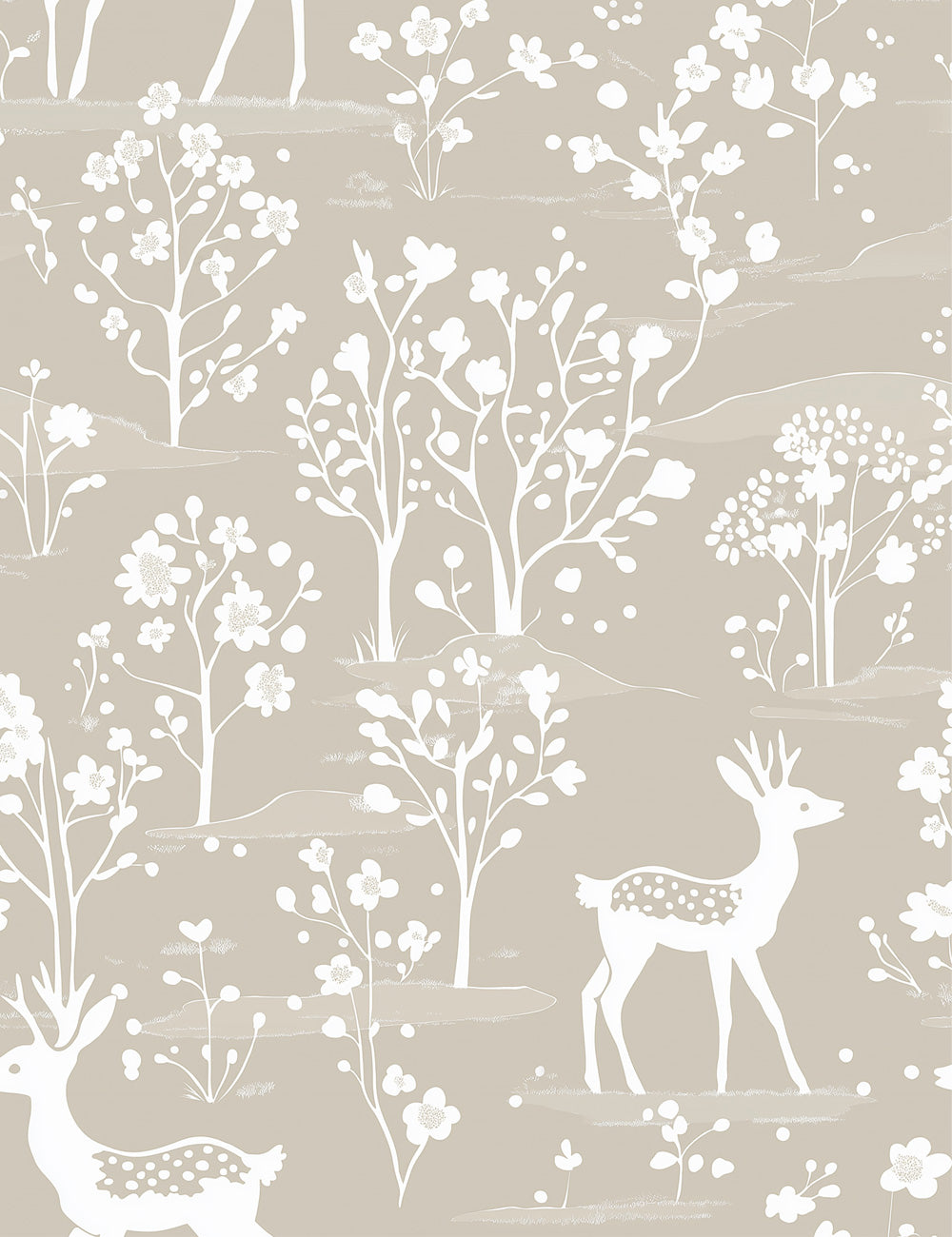 Papier peint avec faons et arbres dans la forêt en tons gris et blanc, imprimé sur un papier intissé de haute qualité