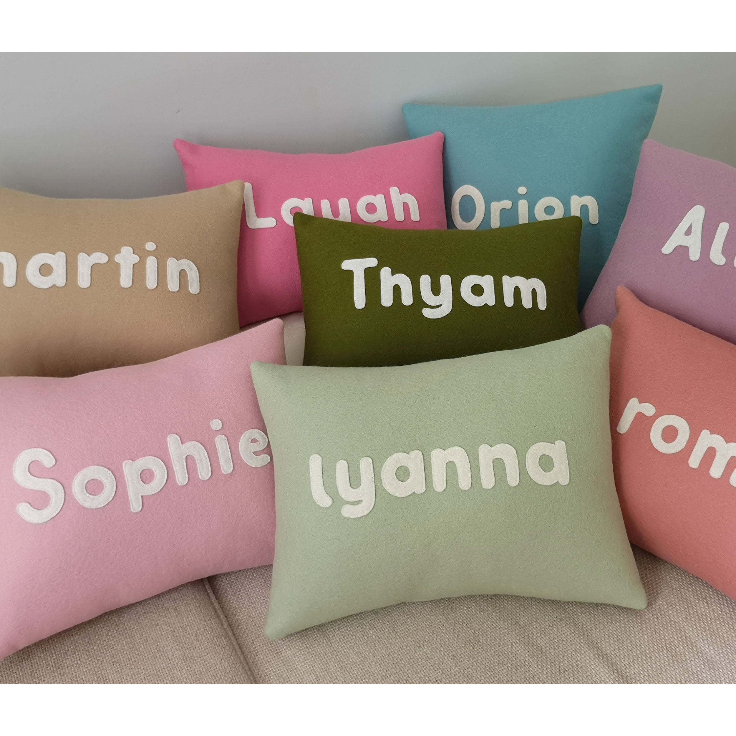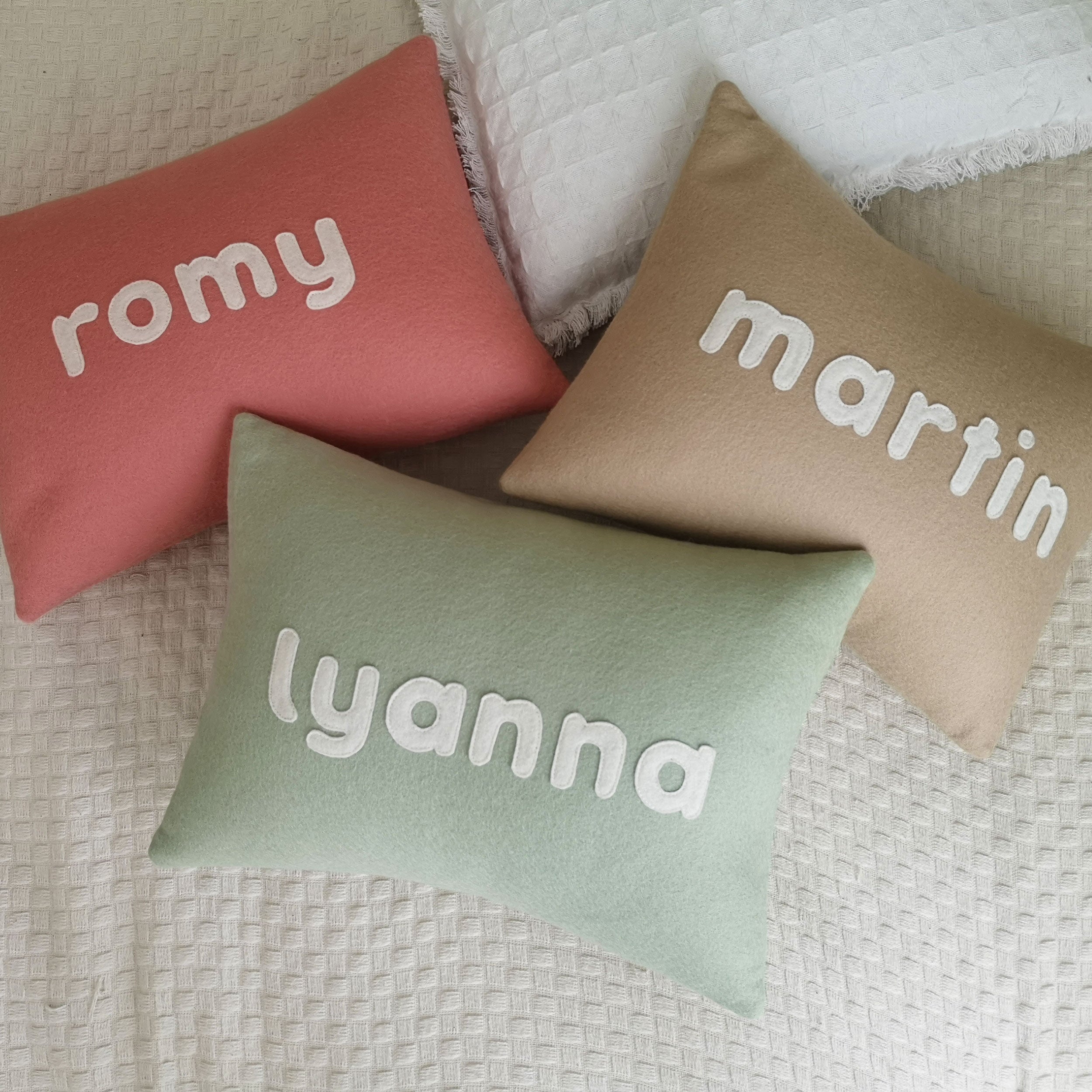 Coussin personnalisé avec prénom en forme rectangulaire - feutre de laine pistache et blanc - Choix de 18 coloris