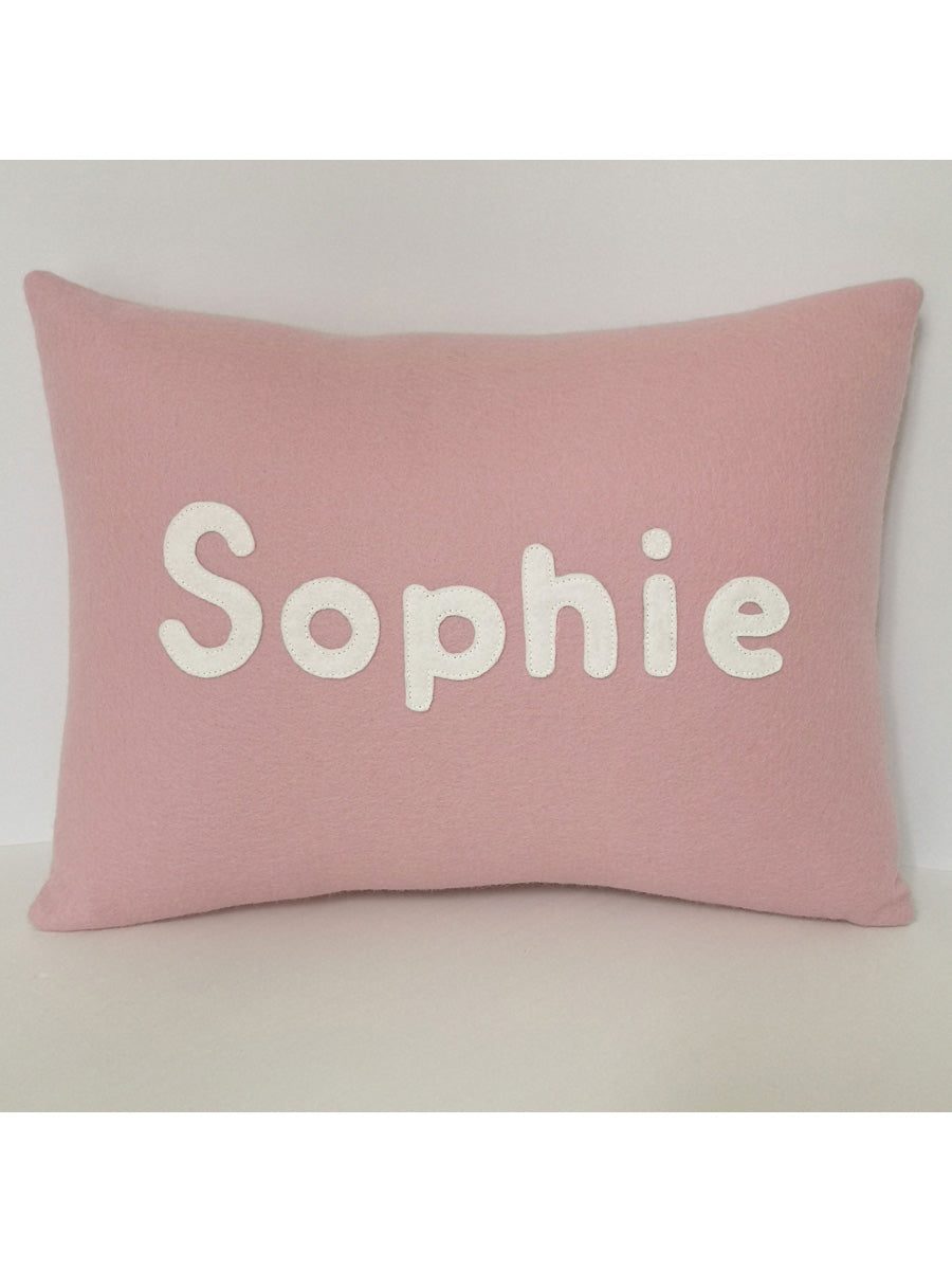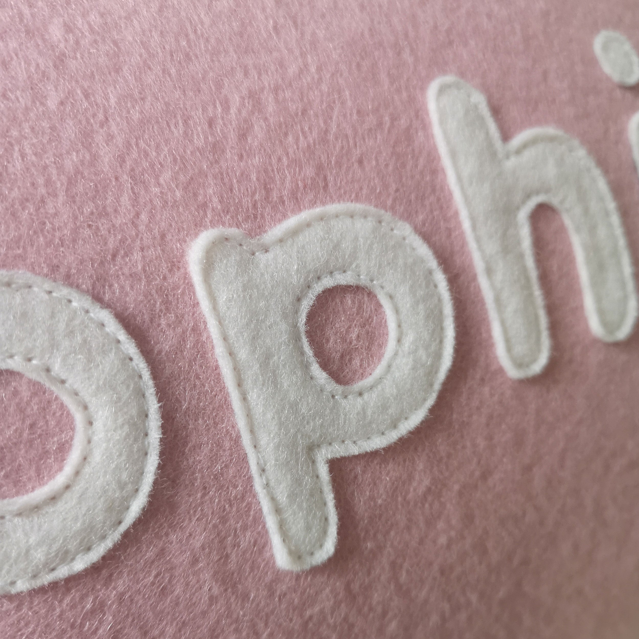 Coussin personnalisé avec prénom en laine feutrée rose bébé et blanc - Choix 18 coloris.