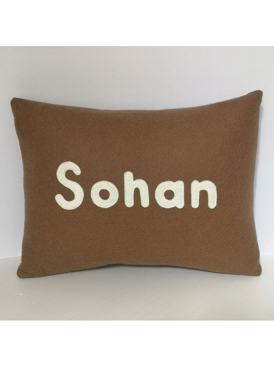 Each letter is hand-cut, applied to the cushion, and sewn on to the base, one by one. The European manufactured insert with a polyester filling is provided. The cushion doesn't have a zip, so is safe for children. Instead, it closes at the back by one side of fabric overlapping the other.